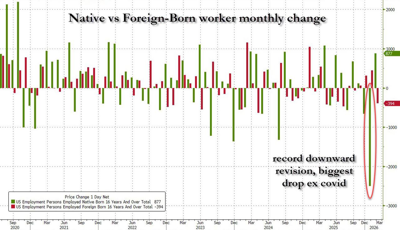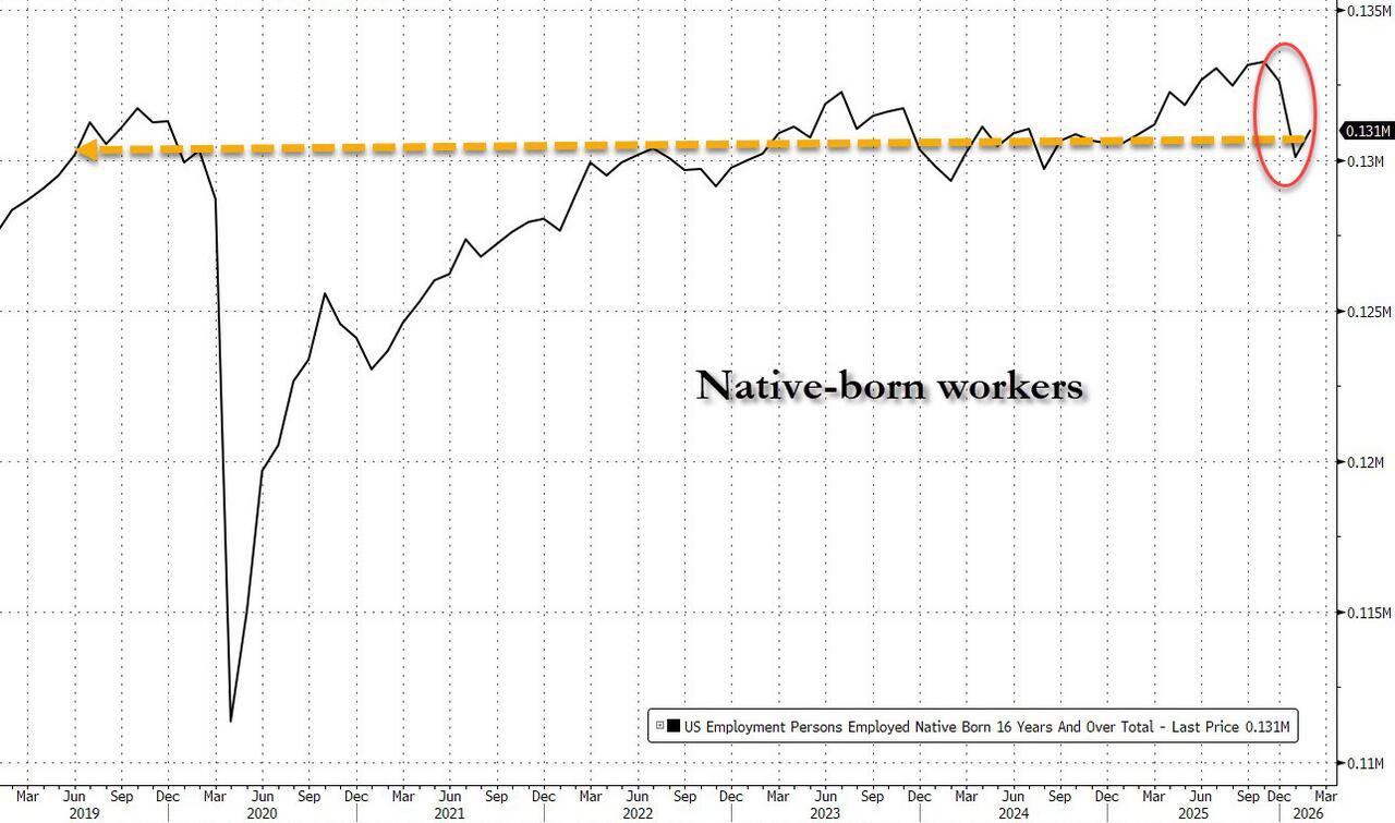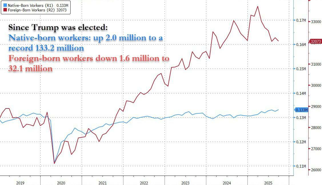 The data showed that since Trump entered the White House "the number of foreign born workers has slumped from a record 33.7 million in March 2025 to 32.1 million, a drop of $1.6 million. This has been offset by a slow but consistent increase in native-born workers which had been unchanged for six years since 2019 until the start of 2025, at which point it started to rise again, and has increased from 131.2 million in March 2025 to a new record high of 133.2 million in September."