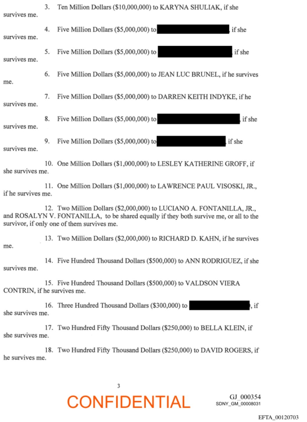Depuis, Bank of America a payé aux victimes 56 milliards, JP Morgan 27, la Citi 15, la Wells fargo 11, la Deutsche 10 et Goldman Sachs 8 milliards de dollars. Et ceux qui en profitent encore son ceux que Epstein a mis sur son testament: à Karyna Shuliak (sa préférée) 10 millions, à Jean Luc Brunel et Darren Indyke 5 millions, 2 à son comptable Richard Kahn, 1 million à son pilote sachant que 4 noms (dont celui de Caroline Lang) ont été caviardés.