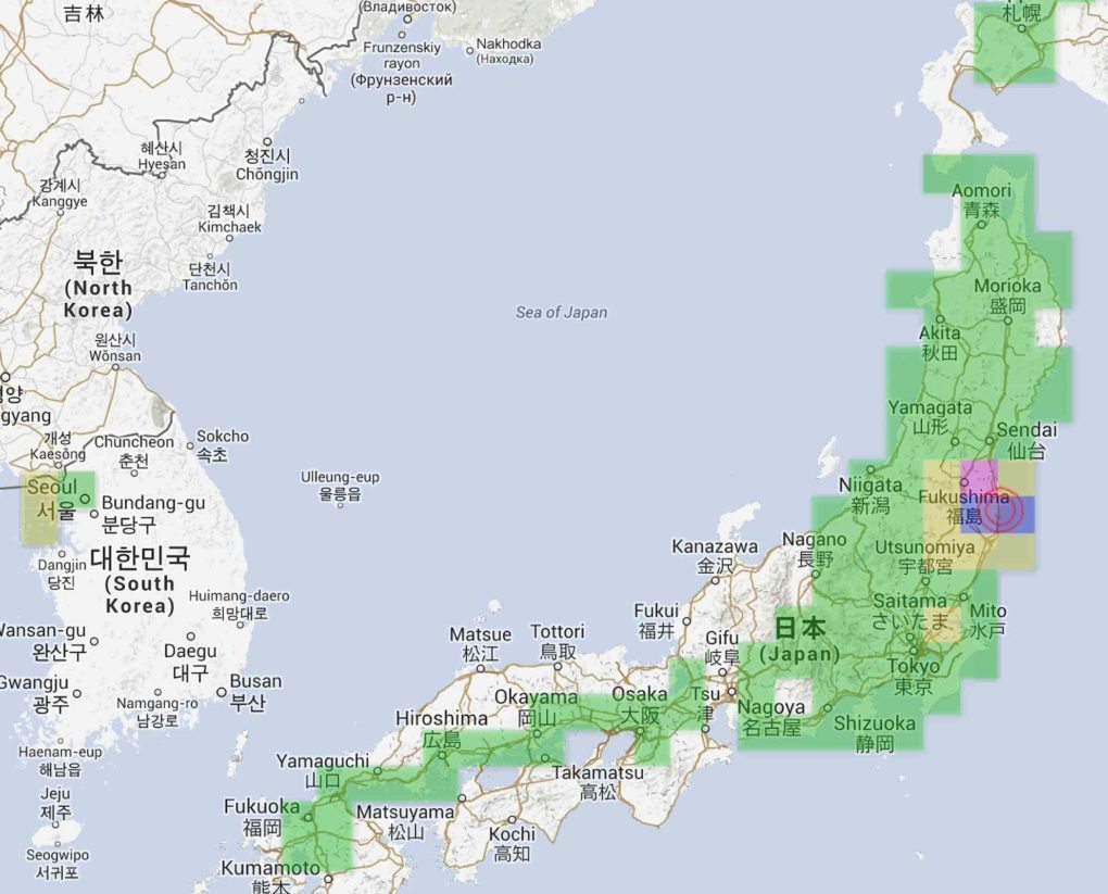 À partir des données récoltées, il a été possible de constituer une cartographie en temps réel, consultable sur le site maps.safecast.org. Le relevé ci-dessous date du lundi 13 janvier 2014. Il révèle de fait des niveaux élevés de radiations. Ici mesurés en cpm, ces chiffres sont des instantanés alors que les degrés de radiations reçues sont souvent publiés annuellement. En pratique, 100 cpm est un seuil anormal qui correspond à un peu moins de 1 microsievert par heure, soit 72 millisieverts par an ou 5 fois le seuil à partir duquel les cancers connaissent une notable augmentation (il s’agit ici des zones en mauve-violet).
