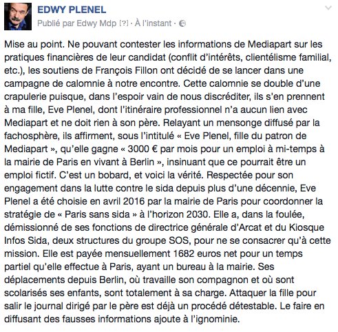 Depuis quelques jours, des militants pro-Fillon accusent en effet sa fille d’emploi fictif. "Eve Plenel, fille du patron de Mediapart, 3.000 euros par mois pour un emploi à mi-temps à la mairie de Paris en vivant à… Berlin !" lit-on sur des montages-photos viraux. Ils citent