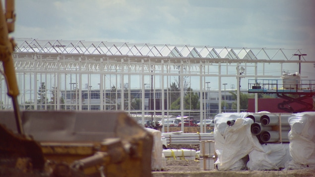 Sur les terrains adjacents à l'aéroport d'Edmonton, les structures qui serviront à accueillir des serres horticoles sont visibles depuis la route. Il s'agit du squelette d'Aurora Sky, une usine de cannabis de cent millions de dollars qui s'étendra sur 74 000 mètres carrés, soit l'équivalent de 16 terrains de football.