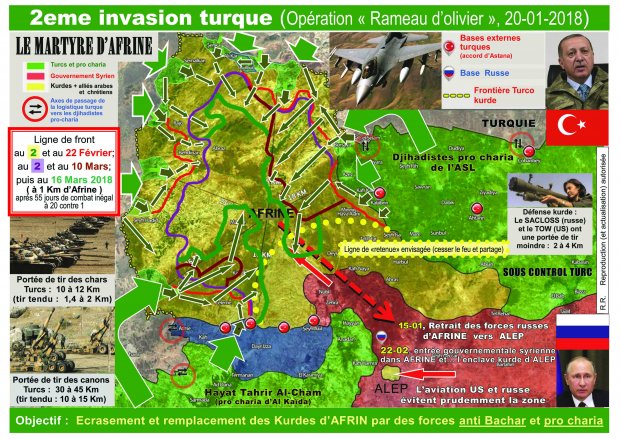 En conclusion, Erdogan a menti depuis le début en invoquant des incidents de frontière et ensuite en parlant de démilitariser sur 30 Km la province kurde. La configuration militaire minutieusement et implacablement suivie pendant 55 jours, puis le bombardement systématique des unités gouvernementales syriennes s’approchant d’Afrine par le Sud en vue du remplacement des unités kurdes, prouve que c’est le vidage de la population kurde qui l’intéresse. Cette purge militaire, politique, culturelle, humaine, est spectaculairement organisée en plein jour au rythme des bombardements, y compris pendant le cesser-le-feu d’un mois voté à l’ONU. Il est vrai, texte à, l’appui, qu’Emmanuel Macron réclamait curieusement un cesser-le-feu uniquement dans la zone de la Ghouta (près de Damas) et non dans la province d’Afrine !...