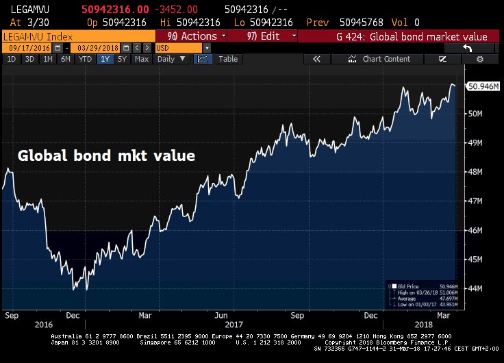 La folie se poursuit ! La plus grosse bulle obligataire en 800 ans d’histoire continue d’enfler et frôle dorénavant les 51.000 milliards de dollars. Rappelons qu’en 2017, le marché obligataire mondial a progressé de 5200 milliards de dollars, soit le PIB du Japon. En ayant gagné près 10 milliards de dollars cette semaine, la capitalisation obligataire mondiale vient d’atteindre un nouveau sommet historique à 50.946 milliards de dollars.