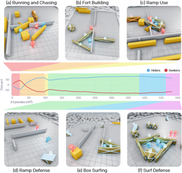 OpenAI, qui est basée à San Francisco, a rendu open-source un environnement d'entraînement destiné aux IA. Cet environnement a déjà été utilisé, mettant en scène différents acteurs contrôlés par des IA. Ceux-ci ont eu pour objectif de se cacher et de se trouver, déployant des techniques de plus en plus sophistiquées pour y parvenir. On retrouve sur les images ci-dessous l'évolution de ces techniques : si, dans un premier temps, les IA ont pu se contenter de se cacher, elles ont par la suite improvisé des constructions et détourné l'utilisation d'objets. Et surtout, ces IA ont travaillé ensemble pour atteindre un but commun.