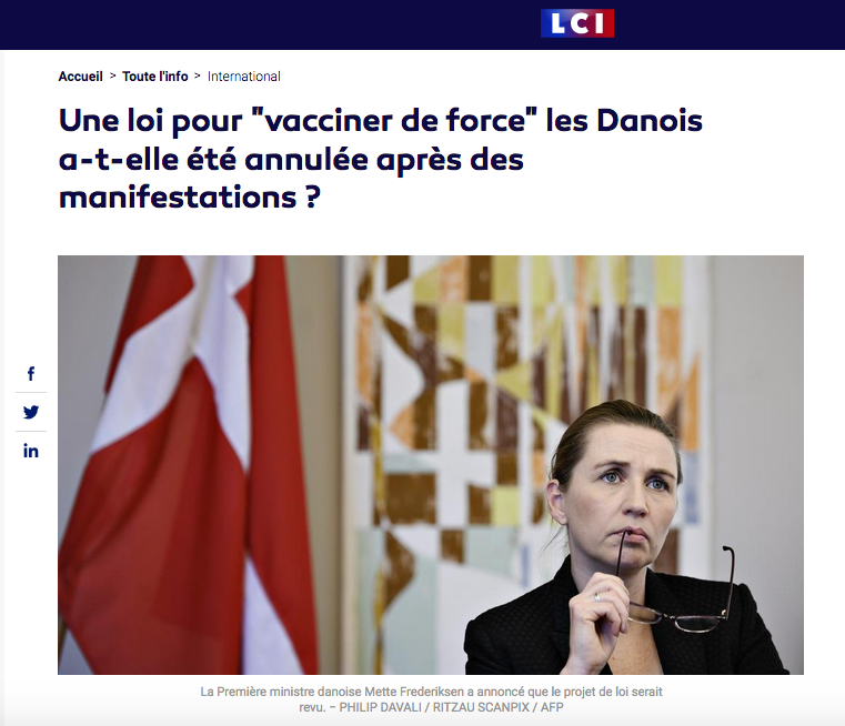 Au Danemark, un projet de loi qui propose notamment de vacciner certaines personnes de manière forcée contre la COVID-19 a été très mal perçu par une partie de la population danoise qui a manifesté plusieurs jours durant. Si la rumeur circule via une vidéo sur internet que cette mobilisation a abouti à l’annulation de cette loi, d’après plusieurs articles officiels, il n’en est rien. La Première Ministre a déclaré qu’elle avait entendu les inquiétudes du peuple, que le texte de ce projet de loi sera discuté avec les différents groupes parlementaires, sans pour autant qu’il soit remis en question.