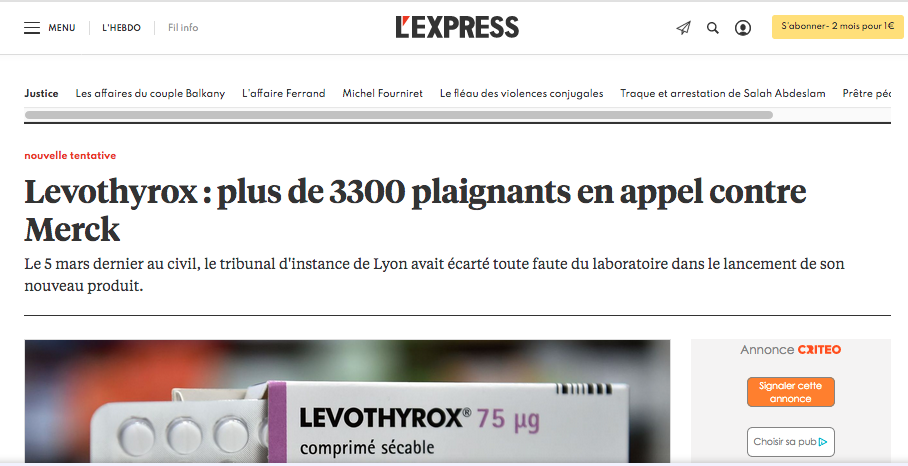 Juin 2021 : les langues et informations se délient dans Libération qui parle d’« incroyable légèreté du fabricant et des autorités ». « Une expertise judiciaire, rendue publique ces jours-ci, met en cause Merck et l’Agence du médicament lors de l’arrivée en 2017 de la nouvelle formule de ce médicament pour la thyroïde utilisé par plus de 3 millions de personnes en France. » Le laboratoire Merck déclarait pourtant en 2017 « que la nouvelle formule était absolument substituable à l’ancienne. Et qu’en plus si la firme avait opéré ce changement, c’était à la demande des autorités sanitaires pour que le nouveau médicament soit encore plus stable. Des propos qui se révèlent inexacts, mensongers même, comme le détaille le rapport d’une expertise judiciaire, rendue publique ce week-end, demandée par le juge d’instruction après les plaintes de plusieurs milliers de patients, victimes d’effets secondaires liés à cette nouvelle formule. »