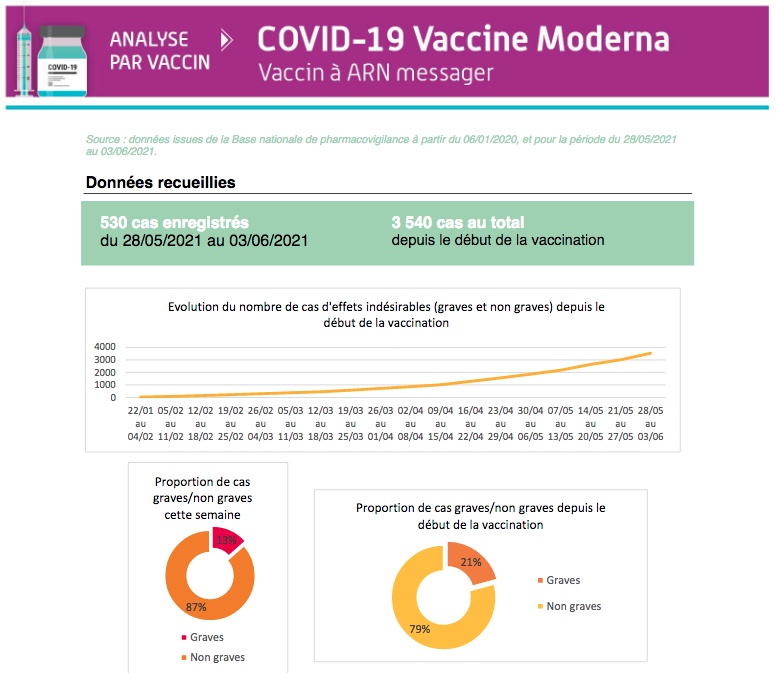 4) Celui qui est à la traîne par rapport à ses concurrents est le Moderna, avec tout de même 13% des effets secondaires déclarés qui ont été considérés comme graves pour la semaine du 28 mai au 3 juin 2021, contre 28% depuis le début de la vaccination.