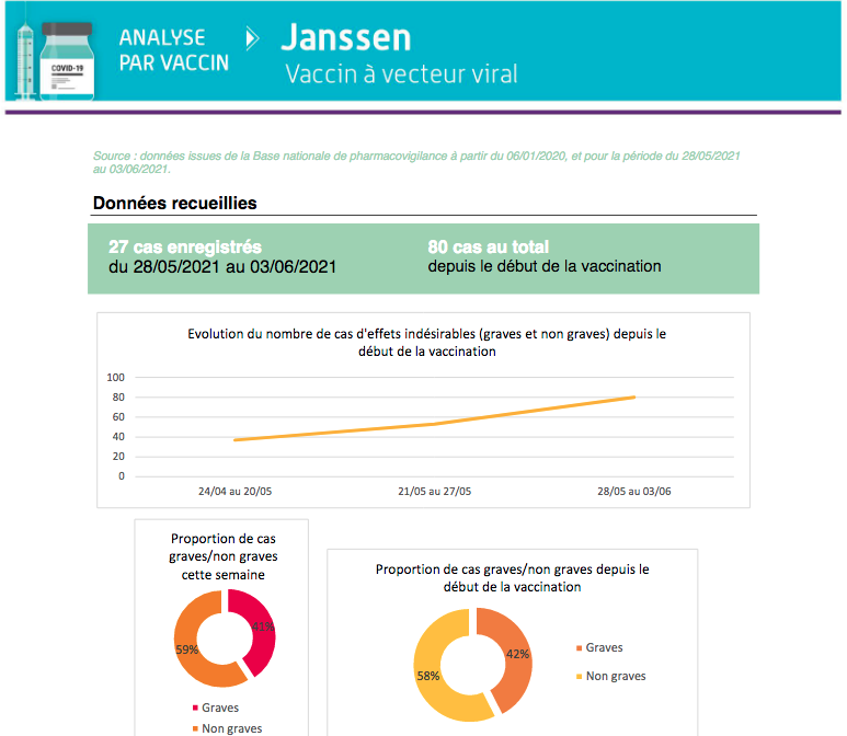 1) Le grand gagnant est le plus récemment arrivé sur le terrain : le Janssen, avec 41% des effets secondaires déclarés considérés comme graves pour la semaine du 28 mai au 3 juin 2021, contre 42% depuis le début de la vaccination !