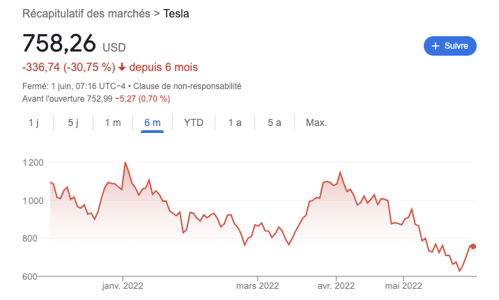 Après avoir atteint un niveau historique de 1 230 dollars en novembre 2021, le cours du constructeur automobile n'a cessé de chuter pour atteindre une valeur de 628,16 dollars le 24 mai 2022. Ces derniers jours, nous avons néanmoins assisté à une petite remontée du cours à 758,26 dollars, mais la situation reste grave pour l'entreprise d'Elon Musk.