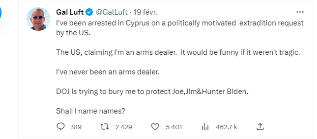 "Gal Luft an Israeli colonel and leader of a Washington think tank has disappeared in Cyprus. He claimed a month ago that the USA authorities were after him because he blew the whistle on the Bidens".
