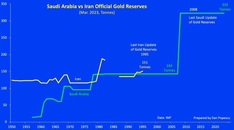 Et du coup, ces dollars vont dans l'or en grande partie: "Les réserves officielles d'or de l'Arabie Saoudite et de l'Iran sont une énigme. Je ne serai pas surpris, avec cette guerre et ces sanctions qu'aussi bien Saoudis qu'Iraniens aient autour de 1.000 tonnes, voire bien plus en réserve".