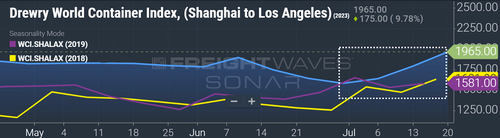 According to the Drewry World Container Index (WCI), spot rates on the Shanghai-Los Angeles route averaged $1,965 per FEU during the week ending Thursday, up 29% from the last week of June. Compared to pre-COVID, WCI rates for this route are 20% higher than at this time in 2018 and 24% higher than in 2019.
