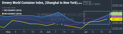 The WCI Shanghai-New York assessment rose to $2,906 per FEU for the week ending Thursday, up 16% since the last week of June, 9% from the same week in 2018 and 3% from 2019.