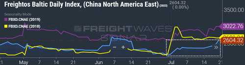 The FBX China-East Coast assessment was at $2,604 per FEU on Friday, up 19% from late June, albeit down 14% from 2019 levels and 3% versus 2018.