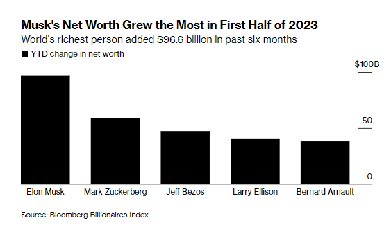 Les riche deviennent (beaucoup) plus riches ! Les 500 personnes les plus riches du monde ont ajouté 852 milliards de $ à leur fortune au premier semestre 2023. Chaque membre du top 500 a gagné en moyenne 14 millions $ par jour. Elon, lui a gagné 96 milliards de $.