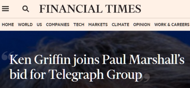 "Ken Griffin aurait rejoint un groupe d'investisseurs dirigé par Sir Paul Marshall pour faire une offre sur le groupe médiatique britannique Telegraph Media Group.
