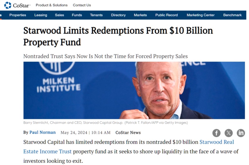 Avance rapide en ce lundi de fin mai 2024, soit 17 ans plus tard, l'Histoire se répète puisque Starwood a pris la même décision, EMPECHER SES CLIENTS DE RETIRER LEURS FONDS ce qui n'a pas manqué de déclencher là aussi une nouvelle panique dans le secteur !