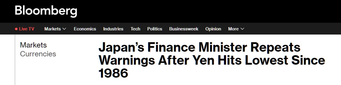 "Le Japon prendra des mesures appropriées si nécessaire pour défendre sa monnaie tout en surveillant les mouvements soudains et unilatéraux, a déclaré le ministre des Finances, Shunichi Suzuki, aux journalistes après que le yen ait atteint son niveau le plus bas par rapport au dollar depuis 1986", lire ici Bloomberg