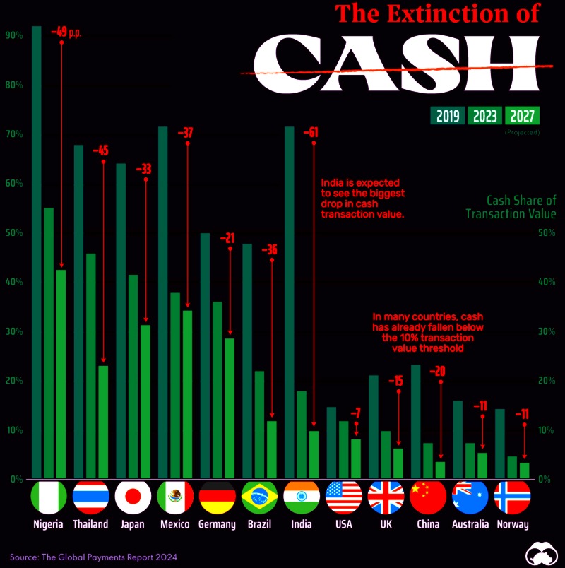 En l'espace de 3 ans, au Nigeria, l'usage du cash est passé de 90% à 55%... EN JUSTE 3 ANS ! Alors qu'à Singapour, la Suisse de l'Asie, c'est tombé à 15% et que les pays les plus en avance en monétique, la Suède et Norvège, il ne représente plus que 5% et 4%