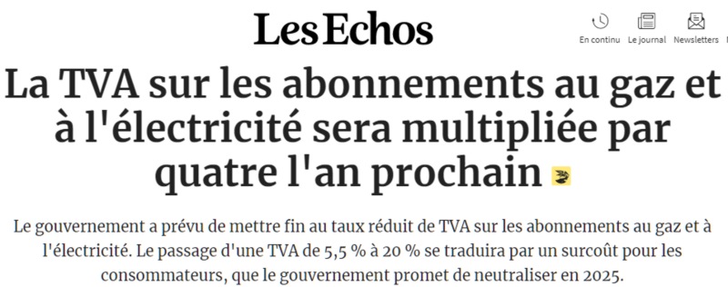 "C'est une petite ligne sur les factures d'énergie qui passe souvent inaperçue : l'abonnement - au gaz comme à l'électricité - bénéficie aujourd'hui d'un taux de TVA réduit à 5,5 %. Cela ne devrait pas durer. Le projet de loi de finances, dévoilé par le gouvernement en fin de semaine, prévoit d'y mettre fin: la TVA sur les abonnements énergétiques remontera en 2025 au taux normal de 20 % - « conformément au droit de l'Union Européenne », explique le texte" lire ici Les Echos pour le croire .
