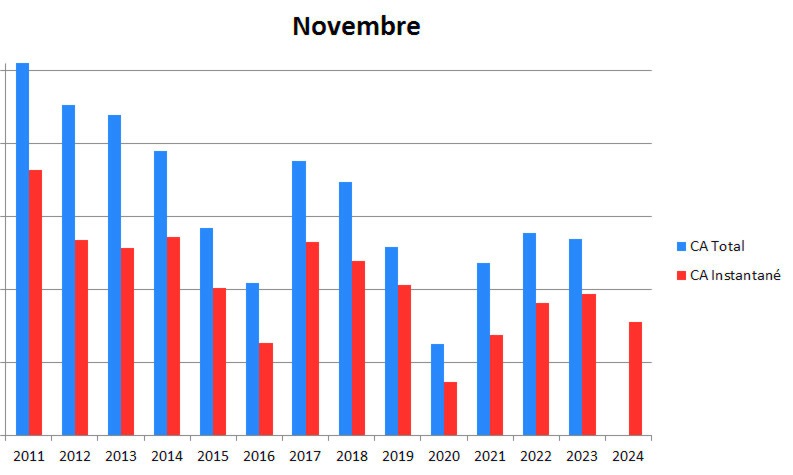 "Je vous redonne des nouvelles " du front " du commerce. Plutôt que des grands mots, voici l'évolution de mon CA depuis 2011 pour le mois de novembre. On se dirige vers un -50% sur 13 ans, avec une chute constante malgré les efforts. Sur le graph, le CA instantané en rouge ("instantané", c'est pour comparer mon CA du mois actuel (pas encore fini) par rapport aux autres mois des autres années au même moment.). Là, c'est au 22 novembre pour toutes les autres, le bleu étant le total du mois achevé".