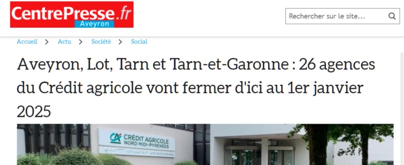 Le Crédit Agricole a donc décidé de dire m**** à ses pauvres fidèles clients du Tarn, du Lot, de l'Aveyron et du Tarn-et-Garonne en fermant carrément 26 agences et cela dans la hâte la plus totale, ce qui, pour moi, est définitivement suspect."