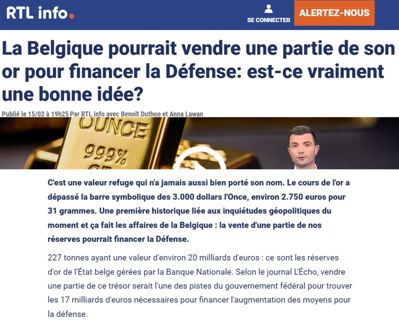 Donc le quotidien belge propose gentiment de vendre l'or des Belges, rien que ça, pour acheter des armes, évidemment, aux Américains pour se défendre contre les Russes. La ficelle est vraiment grosse. lire ici RTL.