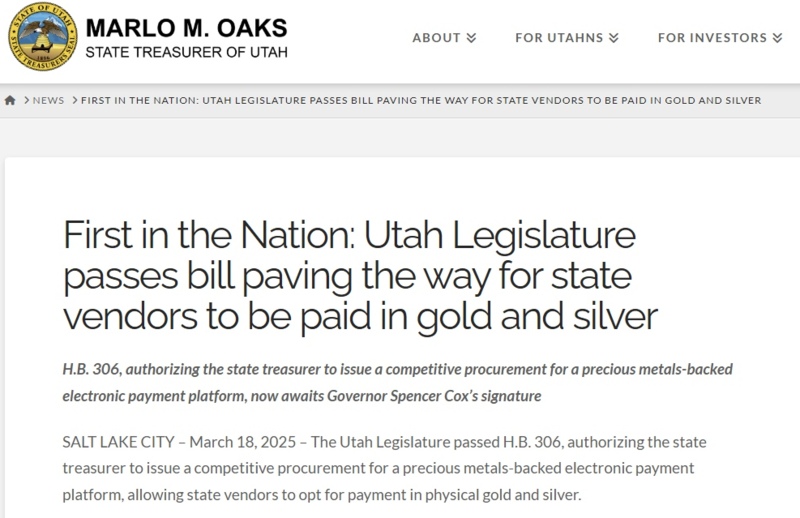 du 24 au 28 mars 2025 :Au moment précis de ce seuil, l’Utah a passé sa loi pour que tout le monde puisse être payé (s’il le souhaitent) en or et argent. Business Bourse a titré: "C’est Historique ! L’Utah devient le premier Etat à passer une législation permettant aux transactions financières d’être réalisées avec des métaux précieux", et qui plus électroniques, garantis par des stocks d’or basés dans l’Etat même, et avec des audits réguliers.