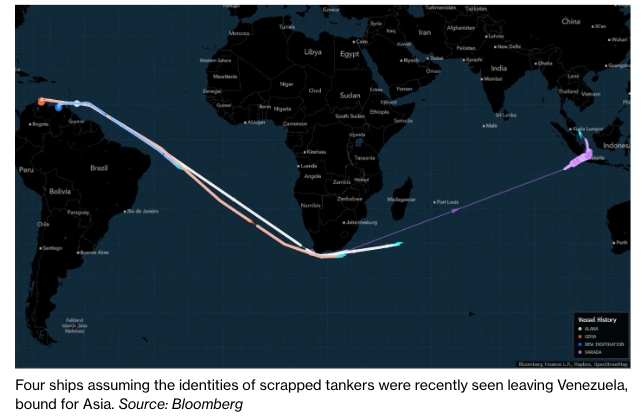 Bloomberg investigators obtained ship-tracking data and satellite imagery showing that at least four zombie tankers have been involved in the Venezuelan oil trade with Asia. At the same time, the Trump administration ramped up maximum pressure, forcing Western oil firms to withdraw from the country.