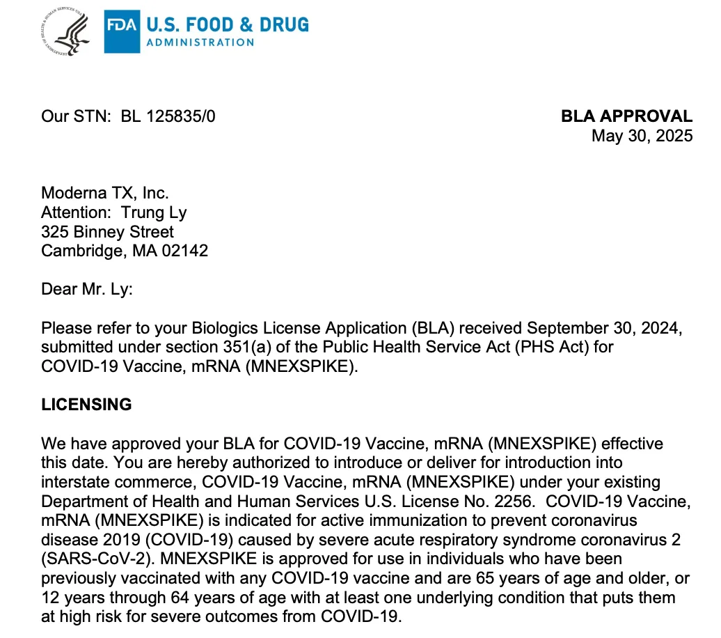 La U.S. Food and Drug Administration (FDA) a approuvé mNEXSPIKE® (ARNm-1283), un nouveau vaccin contre la COVID-19, pour une utilisation chez tous les adultes de 65 ans et plus, ainsi que chez les personnes âgées de 12 ans à 64 ans avec au moins un ou plusieurs facteurs de risque sous-jacents définis par les Centres pour le contrôle et la prévention des maladies (CDC).