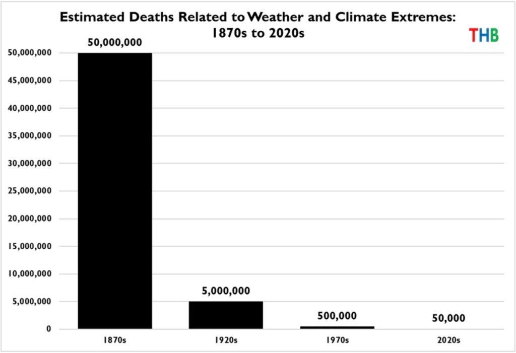 The slump in the extreme weather death in the hydrocarbon age is truly astonishing as the graph below illustrates.