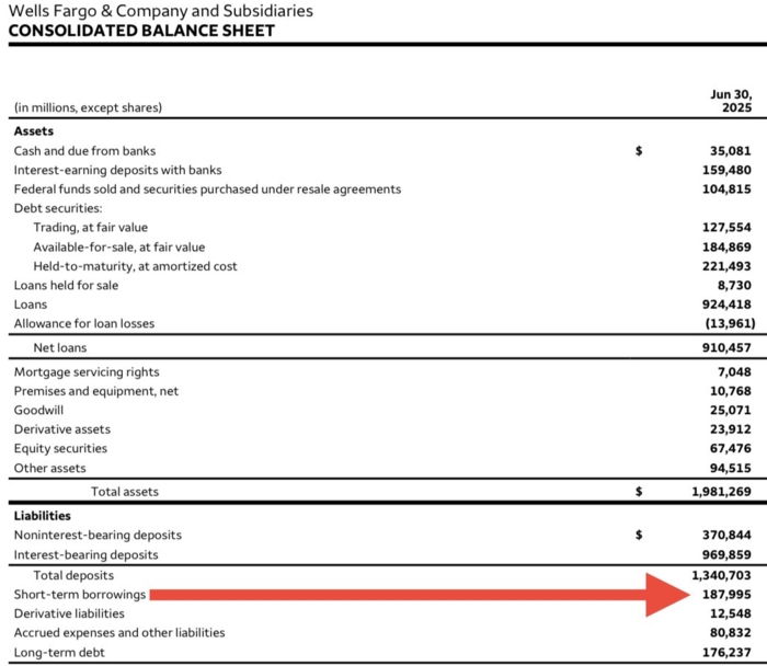 "Wells Fargo borrowed $188 billion last quarter. Let that sink in. This is a sign of desperation. They don't have the cash" notait The Coastal Journal qui poursuit: "Where are they going to get the next $188 billion? It's systemic risk - quiet and dangerous".