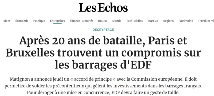 "Paris et Bruxelles trouvent un compromis sur les barrages d'EDF. Un tiers de ses barrages sera vendu" lire ici Les Echos.