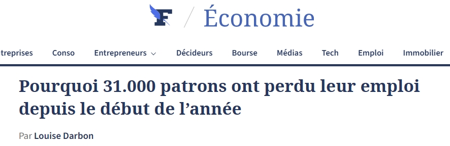 Chefs d’Entreprise (France) depuis le 1 janvier 2025, exactement 170 patrons ont perdu leur emploi chaque jour , soit plus de 31.000 personnes (jusqu'au 30 juin) selon l'Observatoire de l'Emploi des Entrepreneurs 2025-sept