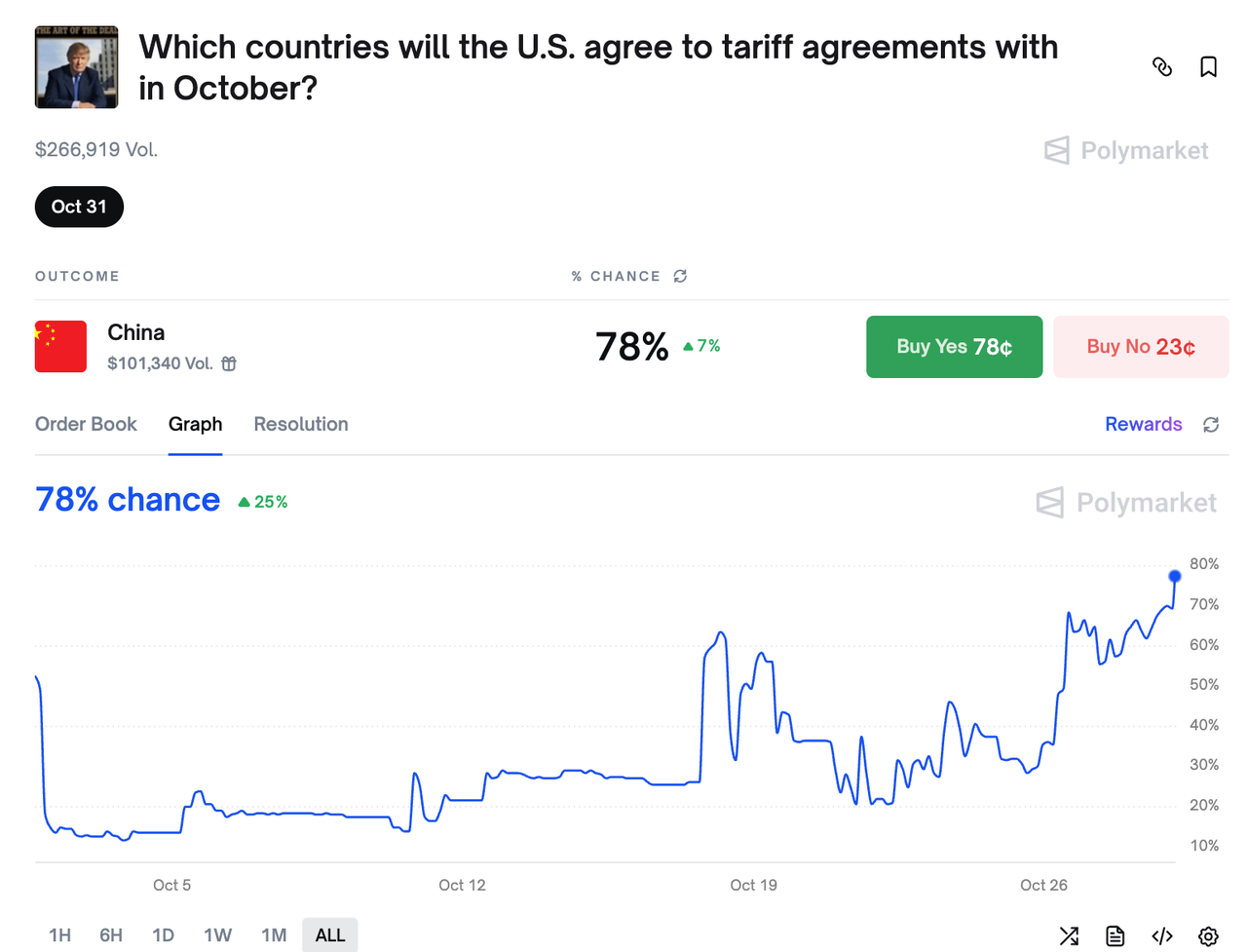 Cryptocurrency-based prediction market Polymarket has odds of around 78% that Trump secures a trade deal with China tomorrow.