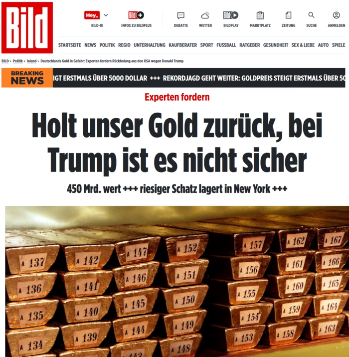 L’article souligne que plusieurs personnalités appellent à rapatrier l’or depuis la Fed à Berlin, ou à tout le moins à réévaluer les fondements sécuritaires et stratégiques de ce choix, lire ici Bild