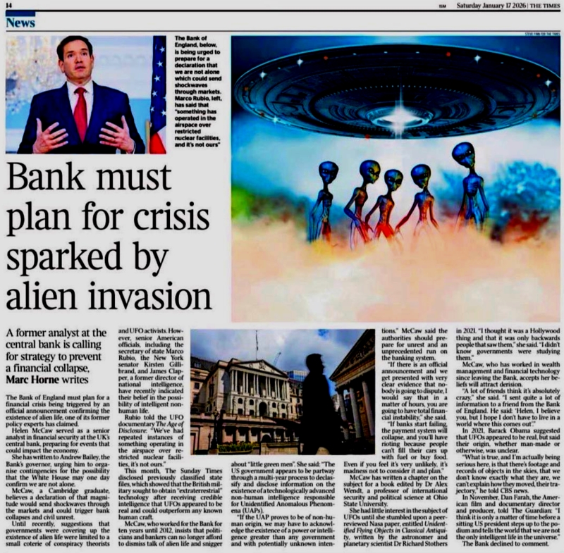 "Il s'agit d'un véritable article de journal rapportant que la Banque d'Angleterre a été invitée à se préparer à un effondrement financier si la présence d'extraterrestres est officiellement confirmée. Helen McCaw, qui a analysé les risques financiers systémiques à la Banque d'Angleterre jusqu'en 2012, a officiellement mis en garde le gouverneur Andrew Bailey contre ce qu'elle appelle un « choc ontologique » – le moment où le public réalise que la réalité elle-même n'est pas celle qu'on lui a présentée.