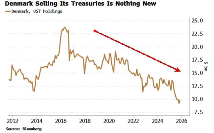 Not only is the $100 million they own infinitesimal in the Treasury market, it doesn’t mark a change in trend: Denmark has been selling down its holdings for the last decade.