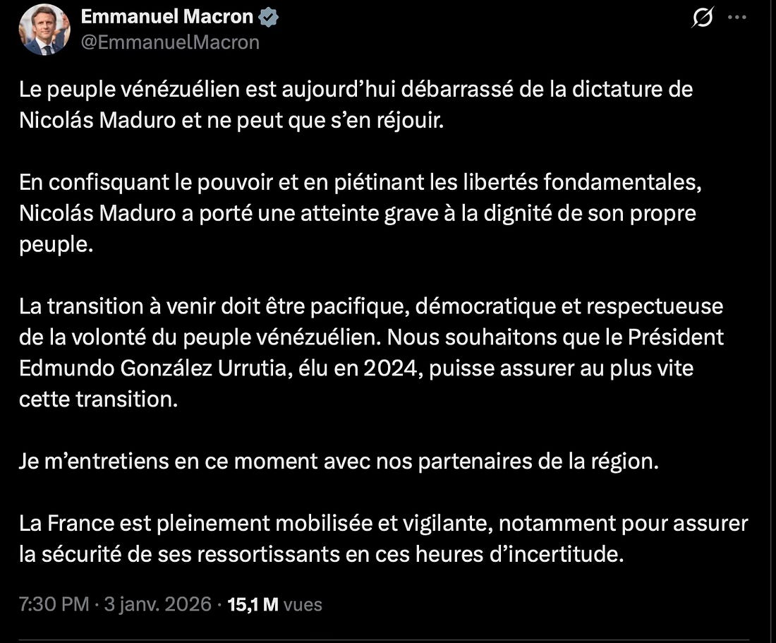 Les responsables européens, de Macron à Starmer, se sont montrés frileux dans leurs réactions et ont refusé de condamner l’attaque, invoquant tous la justification belliciste (comme on s’y attendait hier), affirmant que Maduro est un dictateur voué à quitter le pouvoir. Macron a habilement usé de la voix passive, comme si Maduro avait été destitué par magie plutôt que la cible d’une violente agression.