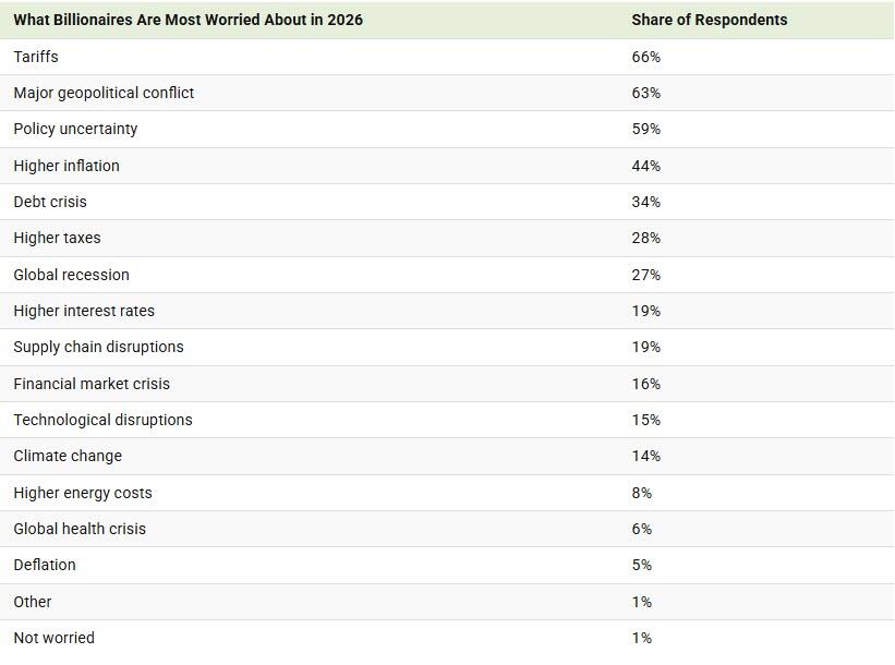 Policy uncertainty is the third-largest concern, flagged by 59% of respondents. Meanwhile, 44% of billionaires remain worried about higher inflation, indicating that price stability is still not taken for granted after years of elevated inflation across major economies.
