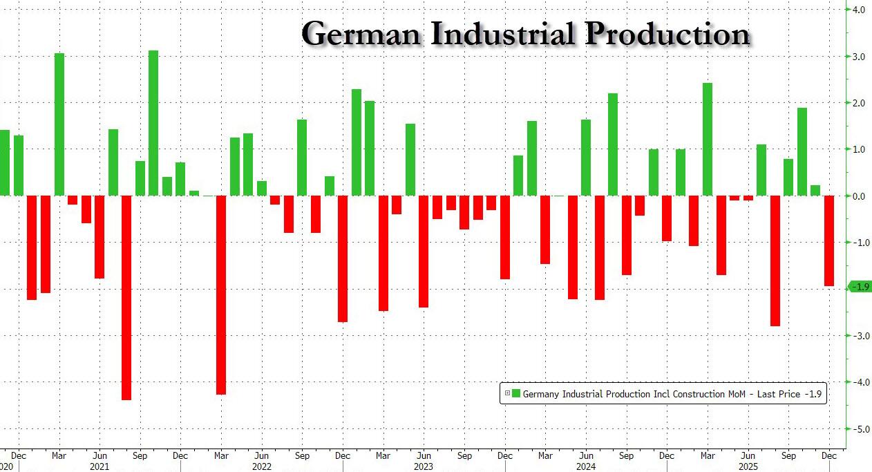 Industrial production, meanwhile, fell 1.9% in December, sliding back into negative territory—a fact largely lost in the media’s cheerleading. That the once-proud German automotive industry saw a 6.3% drop in orders also barely registered amid the general sigh of relief.