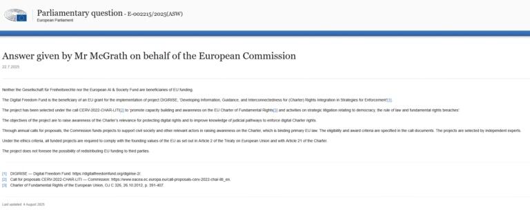 GFF, DRI’s co-plaintiff, has also received support from EU-funded initiatives and participates in projects financed under various European civil society and rights programs, according to a written response by the European Commission to a parliamentary question in 2025.