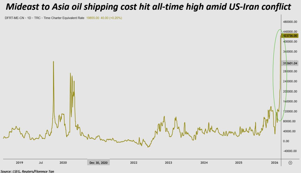Supertanker costs in the Middle East have hit all-time highs, according to shipping data and industry sources on Tuesday, as the U.S.-Iran conflict intensifies with Tehran attacking ships passing through the Strait of Hormuz.