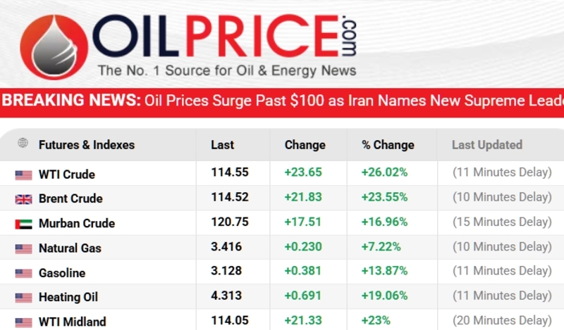 La fermeture d’Ormuz prive le monde d’au moins 20 millions de barils, ce qui a déjà permis au cours du brut de dépasser(à l’heure de ces lignes) les 110 dollars. La note va être douloureuse pour le porte monnaie des 7 milliards d’habitants de cette planète. Si le monde détestait déjà les sionistes, la colère voire haine qui vient fera tomber des gouvernements (vous pourrez suivre les cours ici sur oilprice.com)