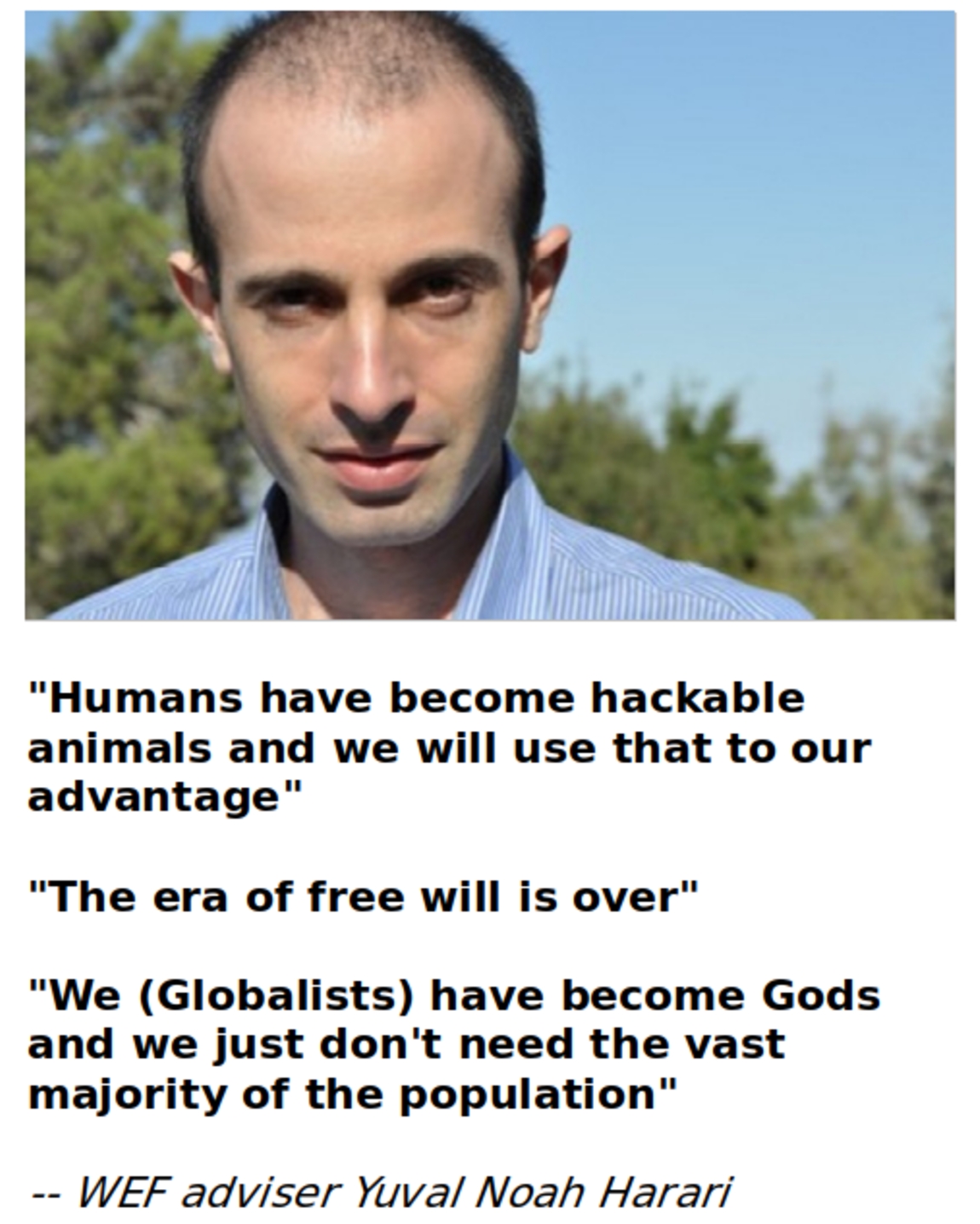 La plus idiote est néanmoins la Lynn (ou Ennui de Rothschild - branche anglaise) puisqu’elle a cru que personne ne ferait la liaison entre ses propos et ceux de l’auteur israelien raciste, eugéniste, Yuval Harari qui avait déclaré que les humains sont désormais des animaux “piratables”, que l’Ere du “libre arbitre” a pris fin et que nous (lire: uniquement les israeliens) sommes devenus des dieux et qu’en conséquence nous n’avons plus besoin de la grande majorité de la population (c’est à dire les goyims). Note: Attali avait déclaré à peu près la même chose voici 12 ans environ... exigeant entre autres la “suppression des retraites” et (je résume sa pensée) des inutiles au-dessus de 60 ans.
