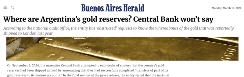 "Un tribunal fédéral a ordonné à la Banque Centrale d'Argentine de communiquer des informations concernant l'emplacement des lingots d'or qu'elle a expédiés à l'étranger en juin de l'année dernière (...) Selon les autorités de la banque, la divulgation de ces données « pose une menace pour le système financier ou bancaire ou pourrait nuire aux intérêts de la Banque centrale ».